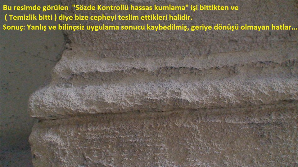 Tarihi eser ve yapılarda mekanik temizlik söz konusu olduğunda durup bin defa daha düşünmek gerektiği kanatindeyiz. Eger şartlar kumlamayı zorunlu kılıyor ise !!!? Burada hangi kumlama yönteminin, hangi kirlenmelere karşı, hangi basınç ve kumlama kumu ile, Hangi elemanlar eliyle uygulanacağı konusu çok önemlidir. Bakın resimlerde gördüğünüz TARİHİ YAPI KATLİAMI sektörün en fazla iş yapan (...!?) firması ve iş birlikcisi; sektörün yüz karası M. (...!?) 'ı tarafından işlenen bir tarihi yapı cephesi cinayetine aittir. Aslına bakarsanız kendileri nelere mâl olduklarının, ne kadar kötü bir işe yol açtıklarının bile farkında değiller.